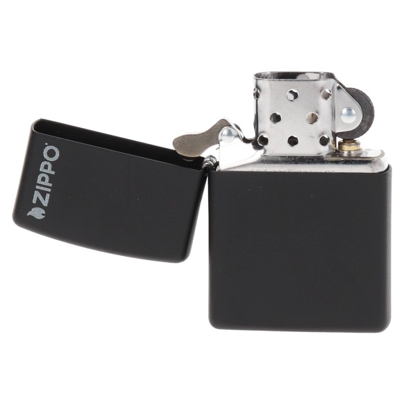 Αυτός ο αντιανεμικός αναπτήρας Zippo με φινίρισμα Black Matte είναι διακοσμημένος με το κλασικό λογότυπο Zippo.